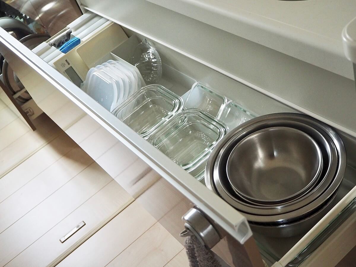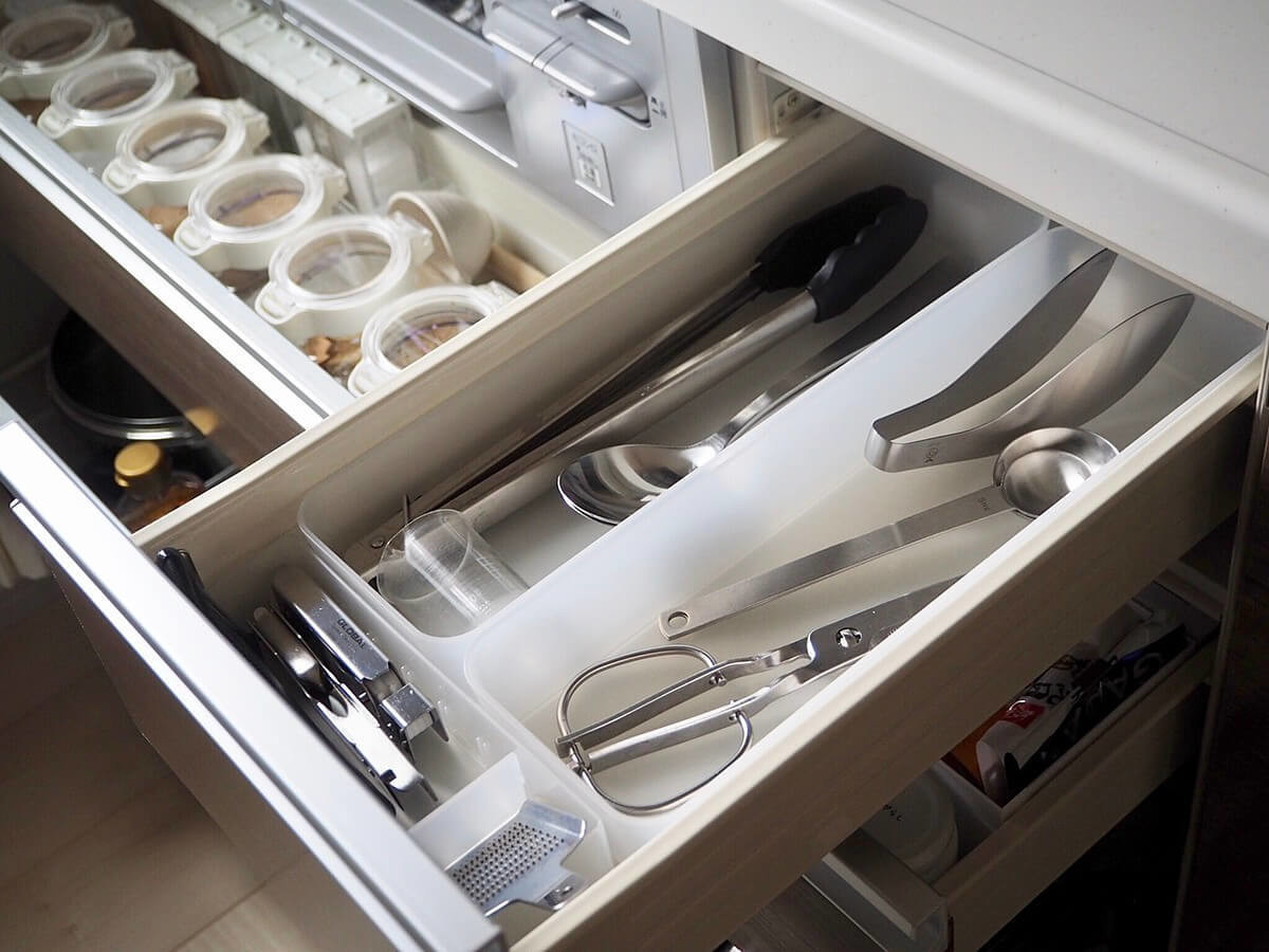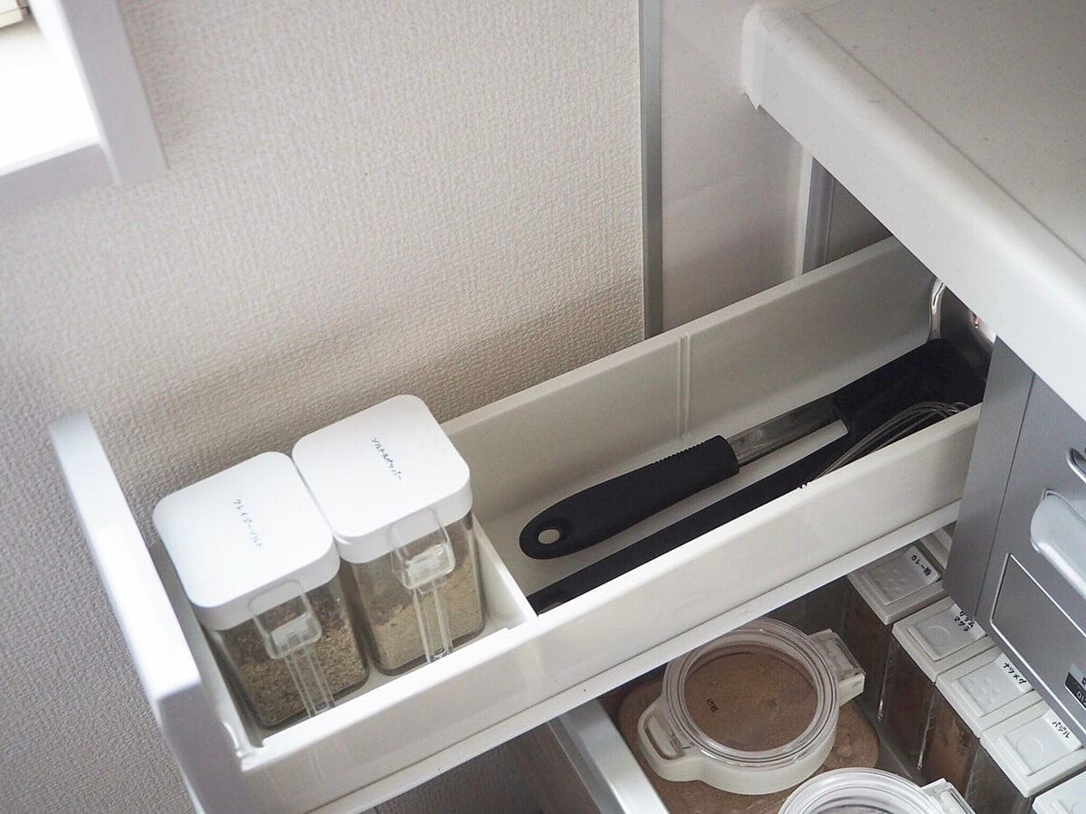 出番は少ないけど、ないと困る2軍のツールは出しっぱなしにしていると油でギトギトになってしまうので引き出しに収納。お手入れをする手間が省けます!