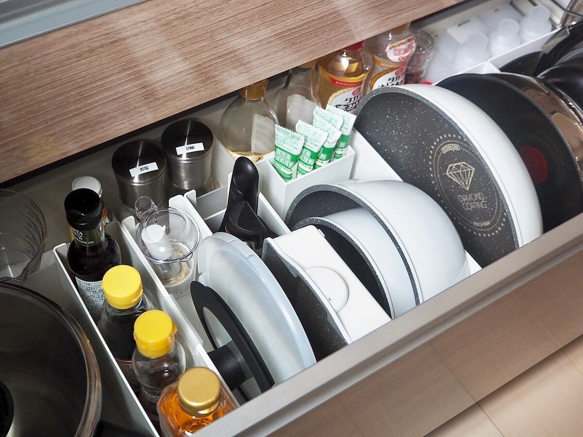 液体調味料、フライパンや鍋を立て収納しています。 横にして重ねると両手を使わなければ取り出せませんが、立てて収納する事で片手でオッケー!