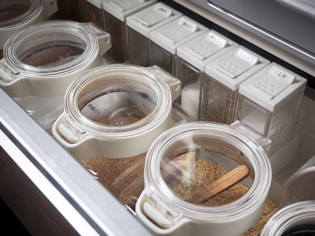 コンロ下の上段には粉物の調味料を詰め替えて収納しています。