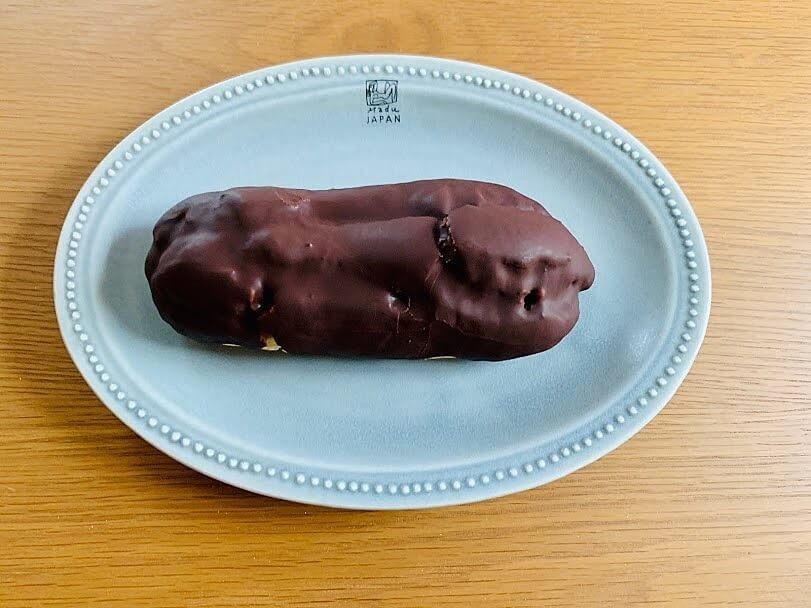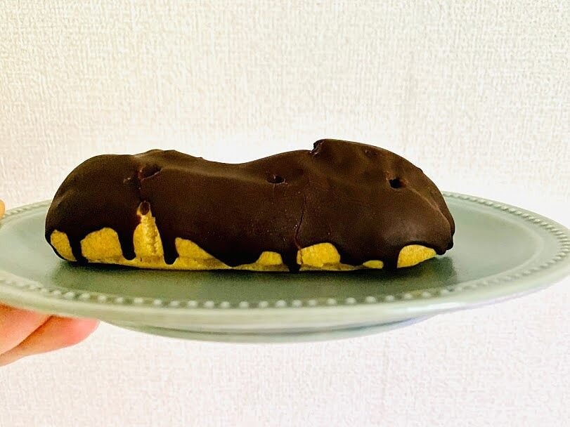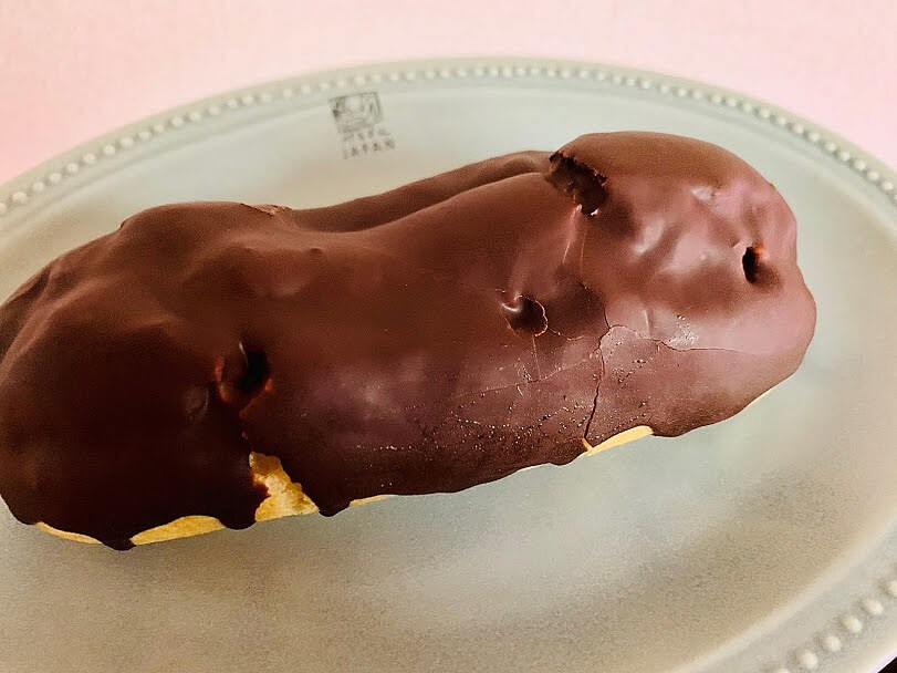 上から見るとチョココーティングのおかげで真っ黒!エクレアってこんなに全面チョコで覆われていたっけ!?と驚きました。生地が見えません。