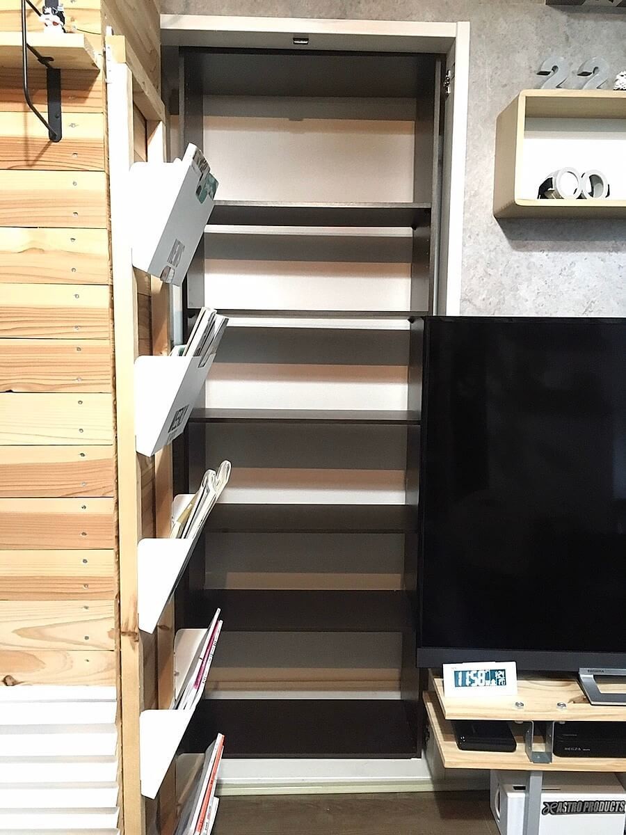 リビングの収納スペースを増やしつつ、見た目もスッキリと使いやすい「見せる収納スペース」にしました。
