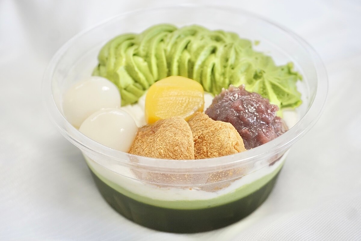 下から、抹茶ゼリー、抹茶ムース、ホイップクリームの上に、白玉、粒あん、栗、わらび餅、抹茶ホイップが乗っています。