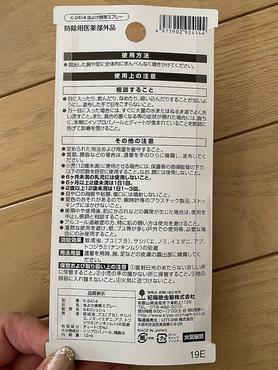 もちろん虫除けスプレーは、ドラッグストアにも売っていますが、小さなカバンにも入るこのタイプがわたしにはベスト。 もちろん価格は100円(税別)。1シーズンで使い切り、来シーズンはまた新しいものを買います。