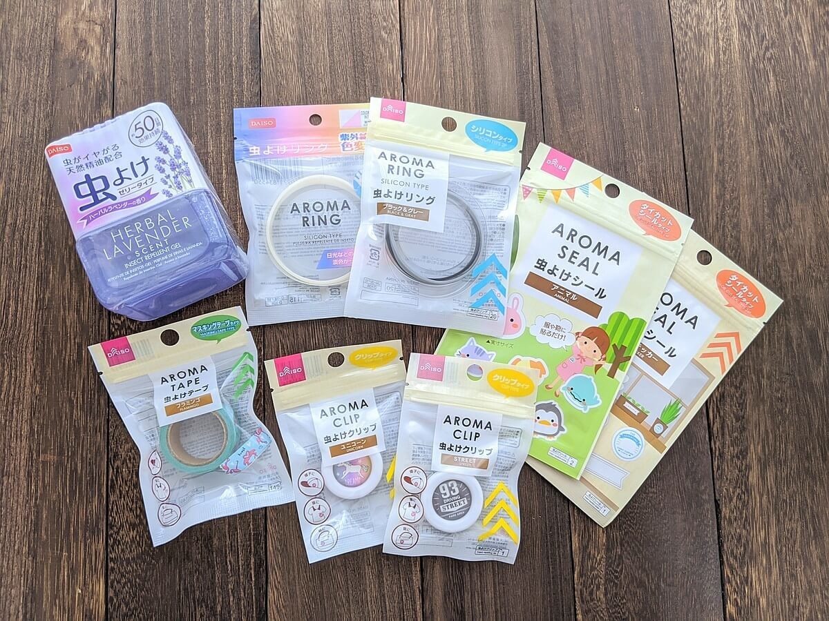 私が購入した虫よけグッズはこちらです。 全部で5種類あり、どれも100円(税別)です。