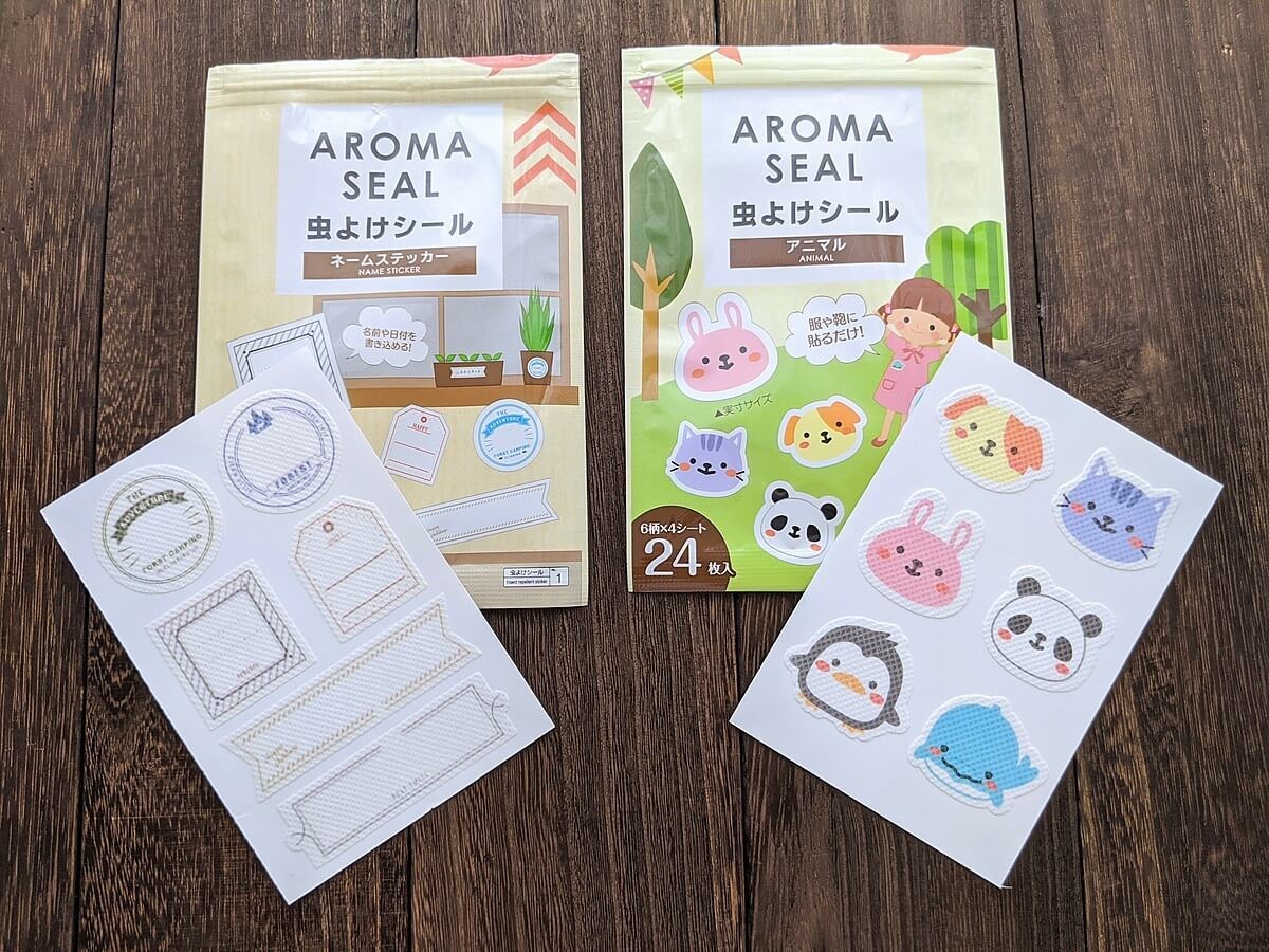 ダイソーの虫よけシールは、「ネームステッカー」と「アニマル」をチョイス。 どちらも6柄×4シートで、全部で24枚入っています。