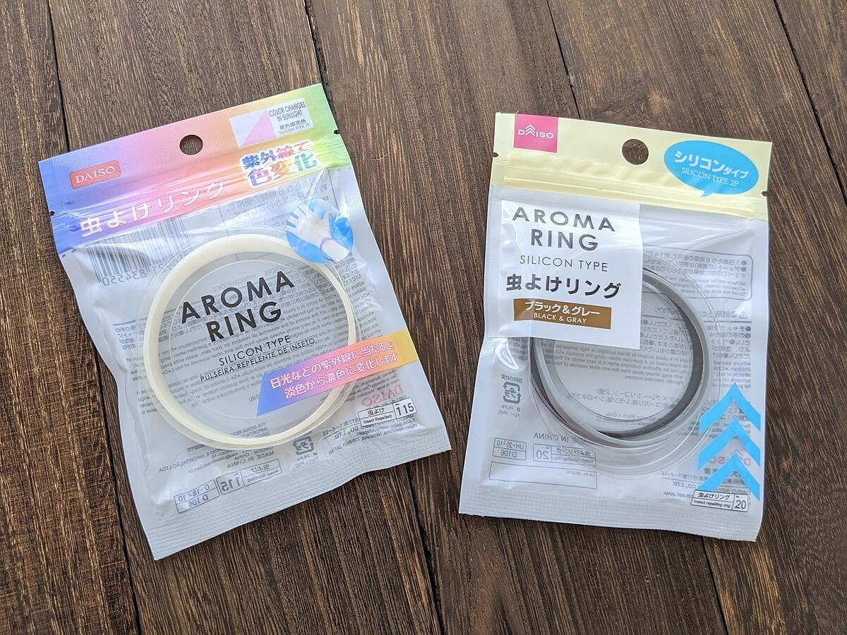 ダイソーの虫よけリングは、びっくりするほど種類が豊富でした。 その中でも私は、ブラックとグレーの2個入りリングと、紫外線で色が変化するタイプのものを購入しました。
