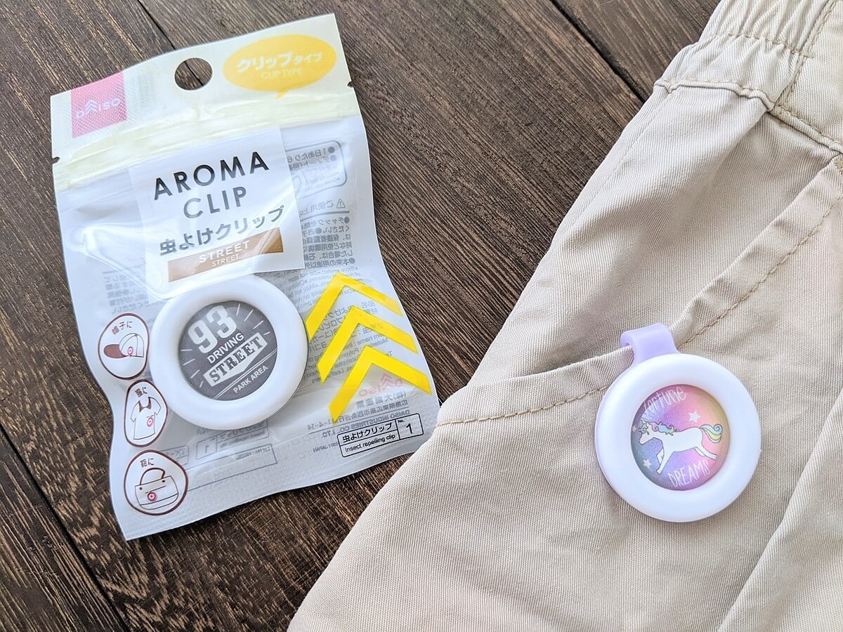 娘が見るなり飛びついたのが、ダイソーの虫よけクリップ。 クリップタイプなので帽子やポケットなどに簡単に装着できます。