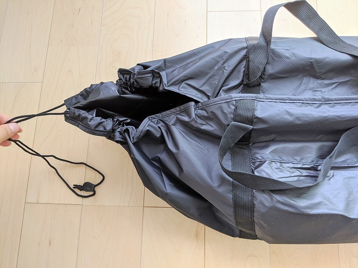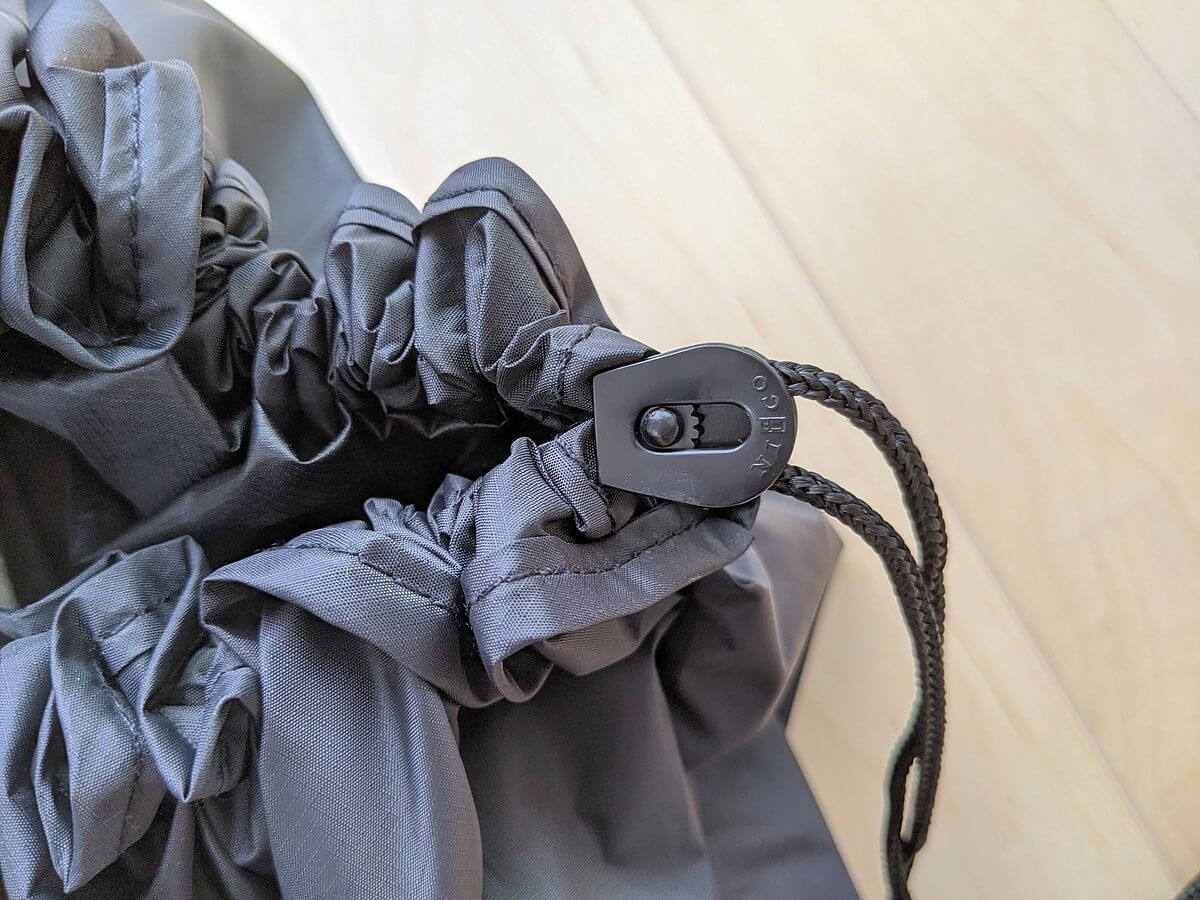 カラーは黒のみ。素材はポリエステル100%で、重さは約105gと本当に軽いです。 荷物を入れるというよりは、包むといった方が良いかもしれません。