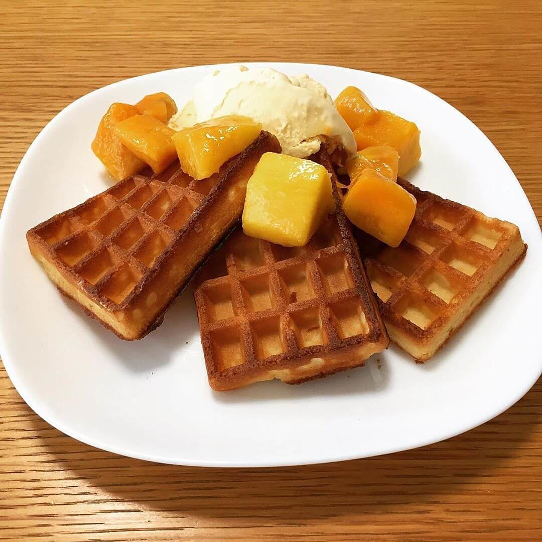 @ri.ri.e_akrさんは業務スーパーのエッグワッフルを使って見た目も豪華な一品をつくっています。 卵をたっぷり使用したエッグワッフルにマンゴーとアイスをプラス。