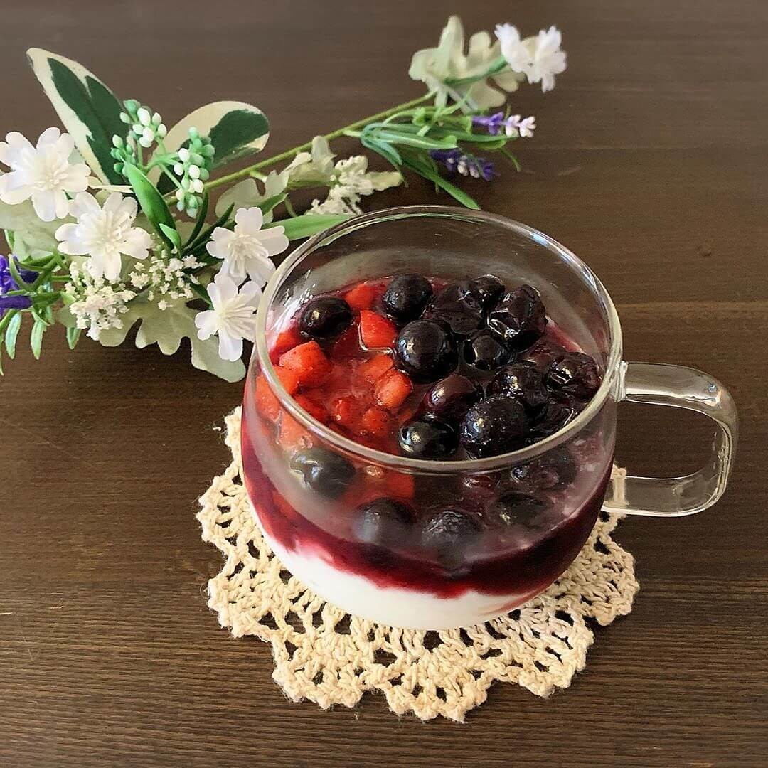 @__chiimama_oven__さんは業務スーパーの冷凍ブルーベリーを使ってブルーベリーソースをつくっています。自家製ソースをヨーグルトにかけたおいしそうなデザートです。