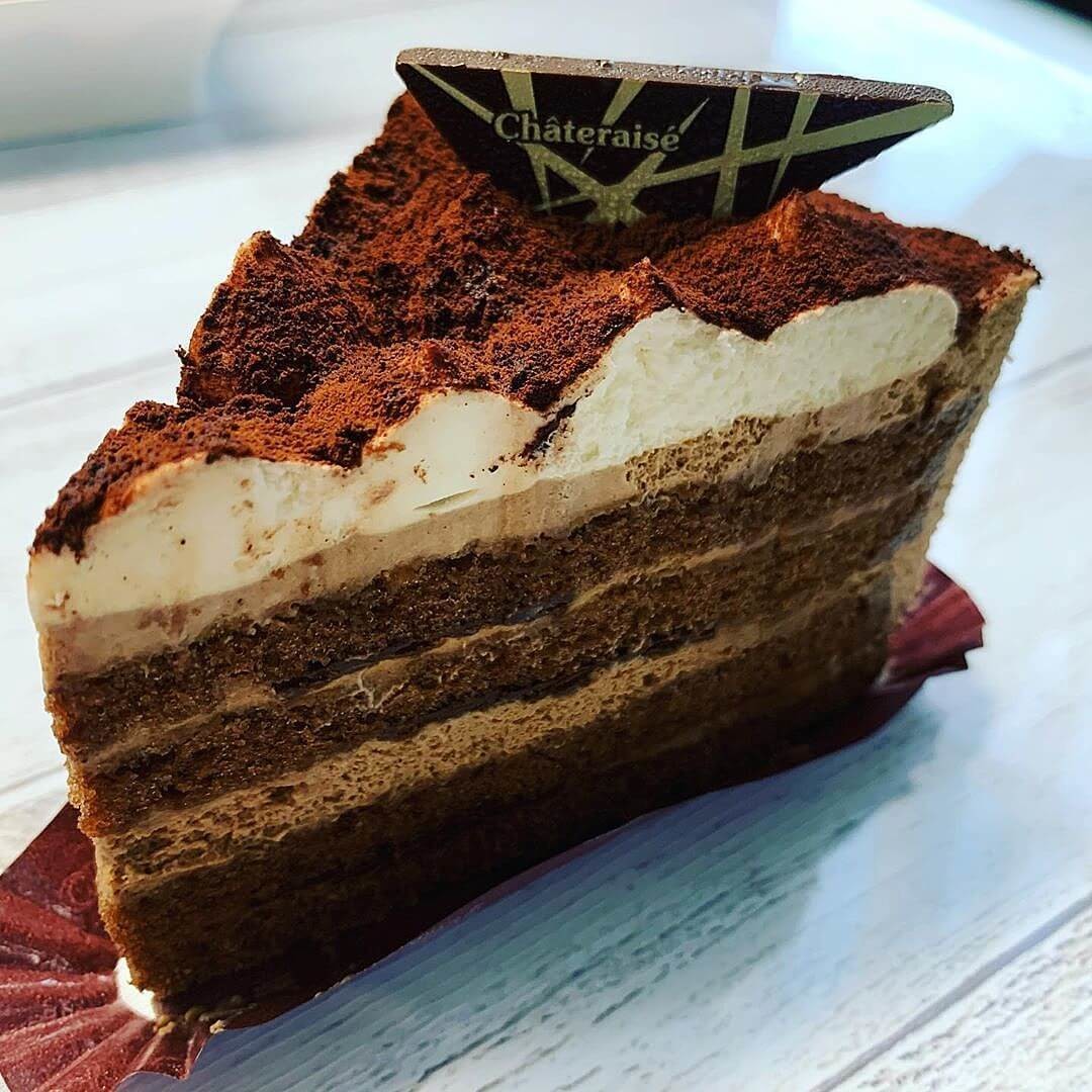 生地にもトッピングにもチョコレートを使用したケーキです。 クリームと生地の層がきれいですよね。薄い板チョコレートも層の間に入っているので、パリっとした食感も楽しめます。