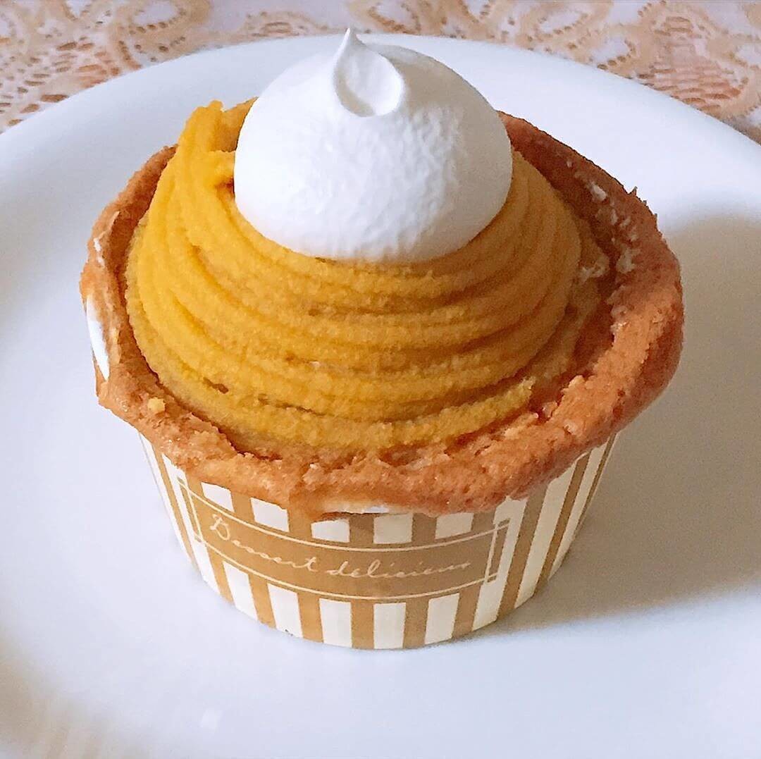 ふわふわなマドレーヌの上にカスタードの入ったホイップクリームがドーンとのっていて、さらにそのまわりに黄栗のクリームがくるくると絞られています。