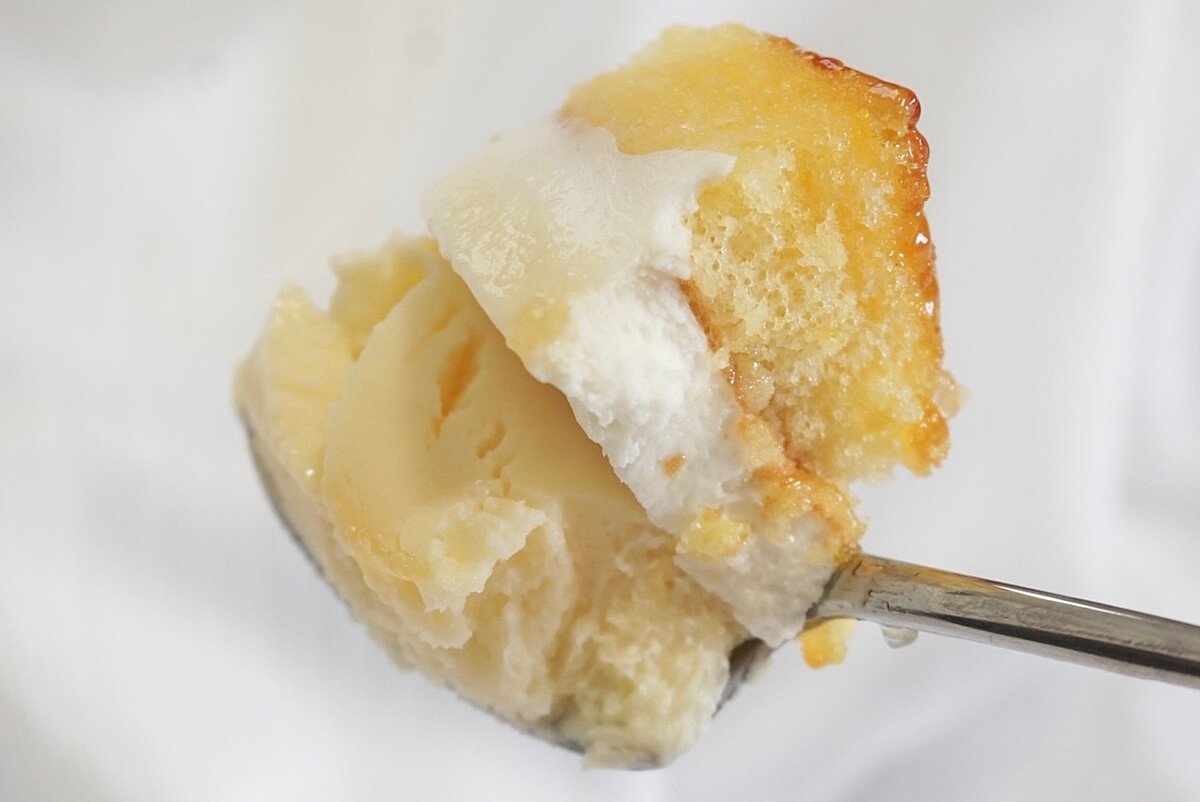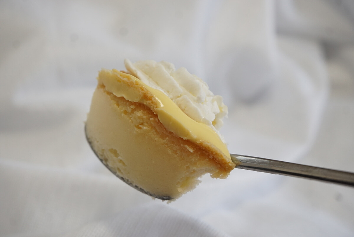 下からベイクドチーズ、レアチーズ、ブリュレされたスポンジと、3層構造になっています。