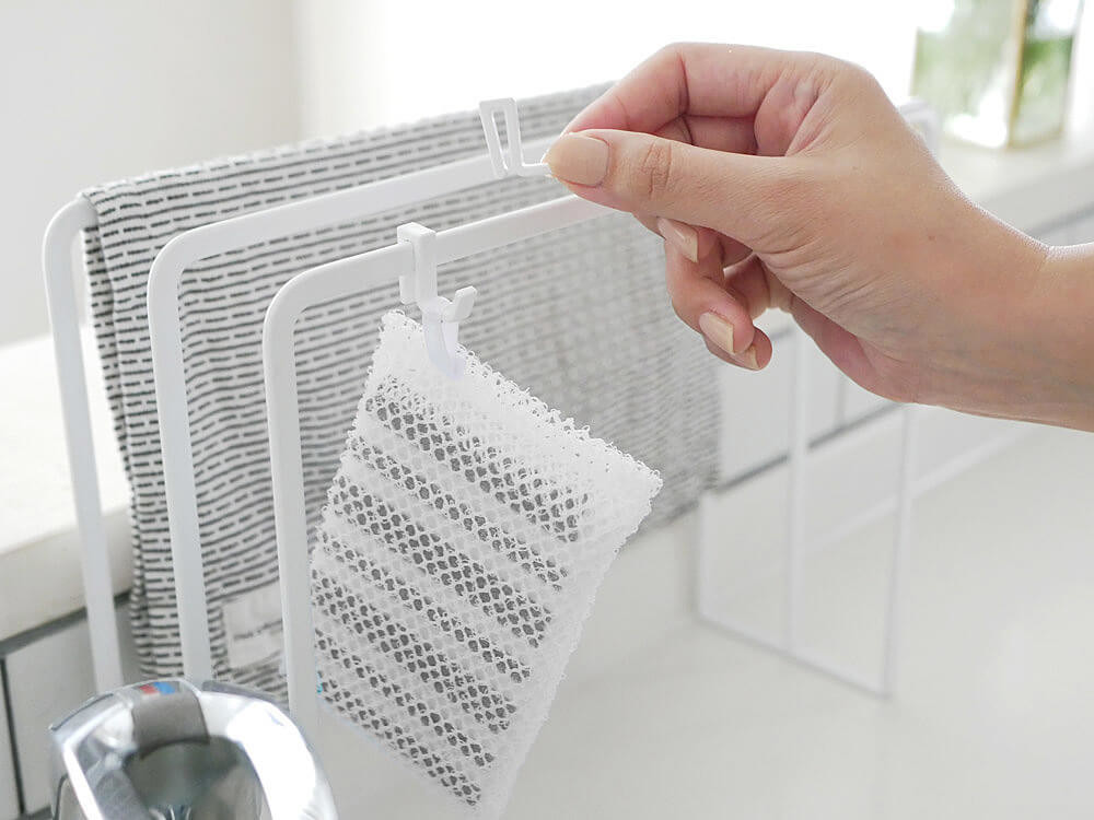 幅は25cm、高さは30cmでコの字型なのでさらに場所を取らずにスッキリとした印象ですね。また、スポンジワイプを乾かす時はクリップで挟むのがおすすめです。