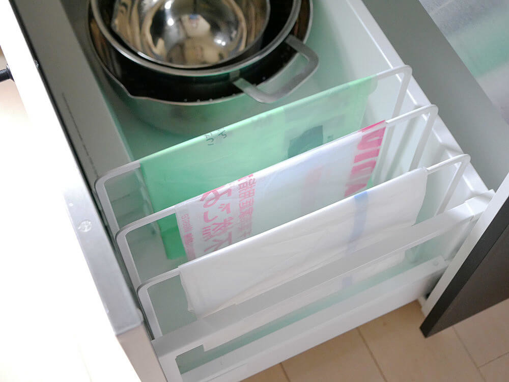シンク下の引き出しの中でゴミ袋収納にも◎。掛けるスペースが3箇所あるので分別され、指先でさっと取り出せます。