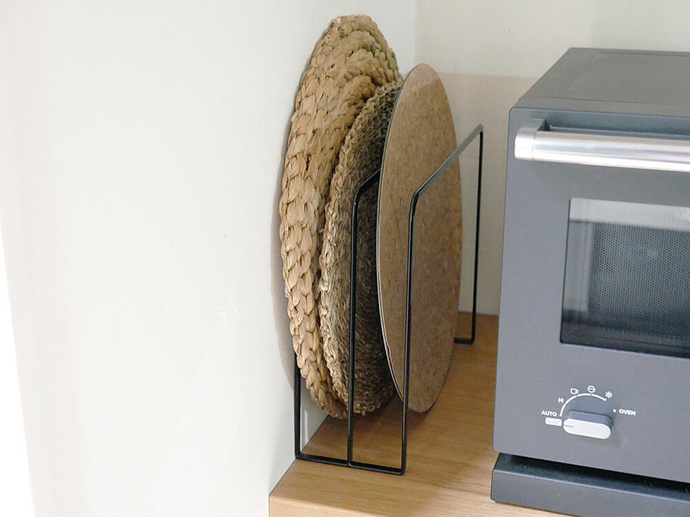 スリムサイズなのに安定感もあるので、軽めのトレイやランチョンマットも。レシピ本も置けたりと、キッチンの隙間収納にも活躍してくれます。