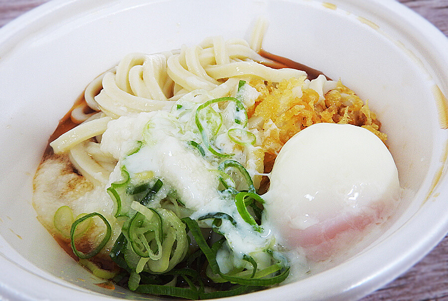 うどんだけでは寂しいので、丸亀製麺「とろ玉うどん(冷)」もお持ち帰りしてみました。とろろと温泉たまごのトッピングが加わった1品です。つゆは、前述した「ぶっかけうどん」と同じく濃い目に仕上がっていました。