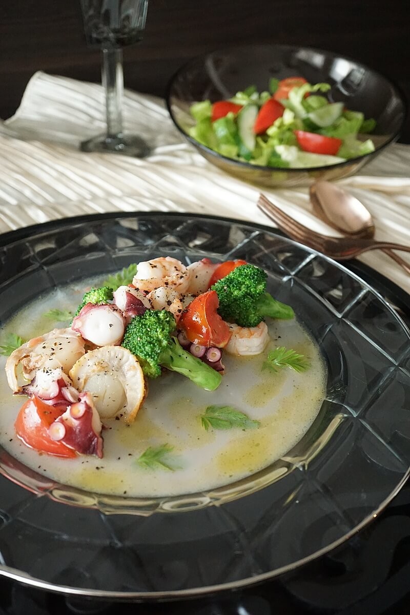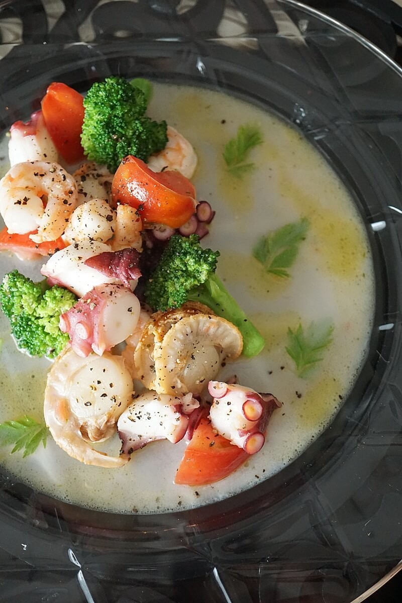 - バターが溶けたらタコ・海老・ベビーホタテ・ブロッコリーを入れて1~2分程度炒めます。