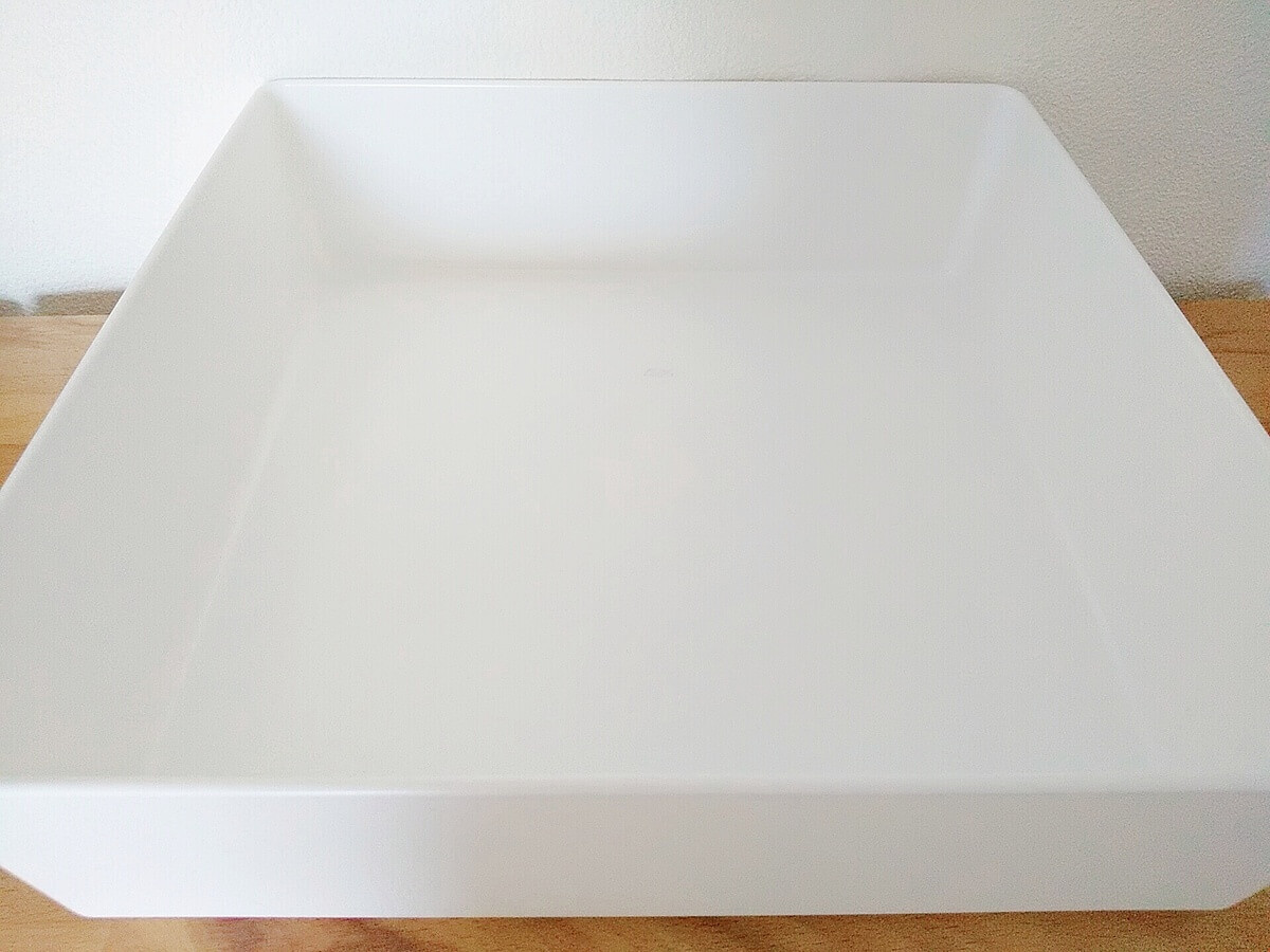 本体ケースだけ見ると、洗い桶みたいですよね。しっかりしていて、力を入れてもぐにゃっと曲がりにくい素材です。静電気のせいで少々ホコリがつきやすいのが欠点かな。