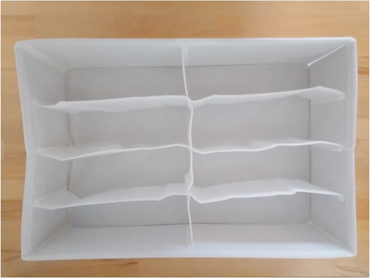 仕切り収納にピッタリなのが、以前ご紹介したこともある「引き出し整理ボックスBH(8マス)」。こちらもニトリの商品で、お値段は272円(税別)と良コスパ。