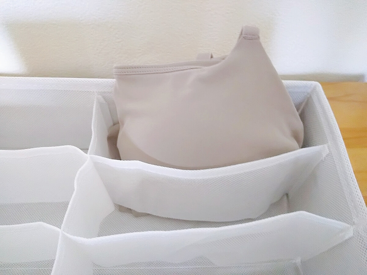 使いやすかったのが、カップがかっちりめのブラ。仕切りがあり、ツルッと滑るプラスチック素材なので、取り出しやすさが抜群。お目当ての一枚をサッと取り出せます。 カップの型崩れを防げるので、大切なブラが長持ちしそうです。