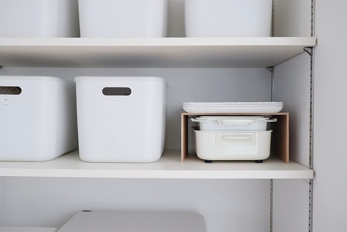 ホットプレートはキッチンの隣にあるパントリーに収納しています。 ここは扉がなくオープンなスペースなのですが本体は棚に置いて見せる収納にしています。
