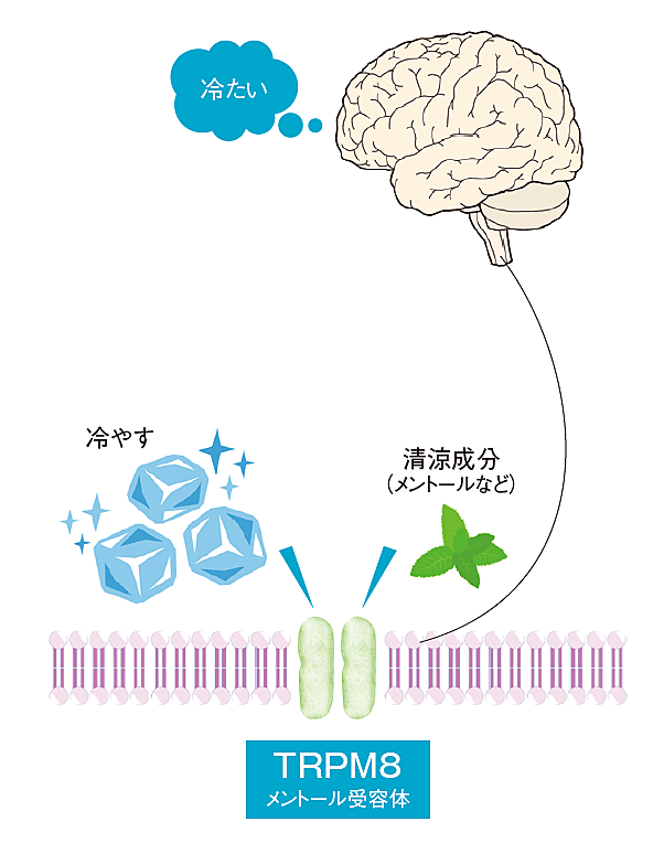 もう1つは、いわゆるメントールなどの清涼成分で、冷感センサーを刺激することで冷たいと感じます。メントールは実際に肌の温度を下げる効果はありませんが、氷などに触れた際に冷たいと感じるのと同じように、冷感センサーを刺激して冷たいと感じる信号を脳に送る働きがあります。