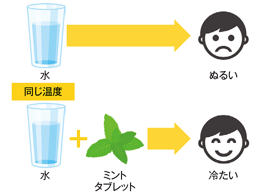 例えば、ミントタブレットを食べたあとに水を飲むとより冷たく感じたり、ハッカ飴は舐めるだけでもスースーしますよね。