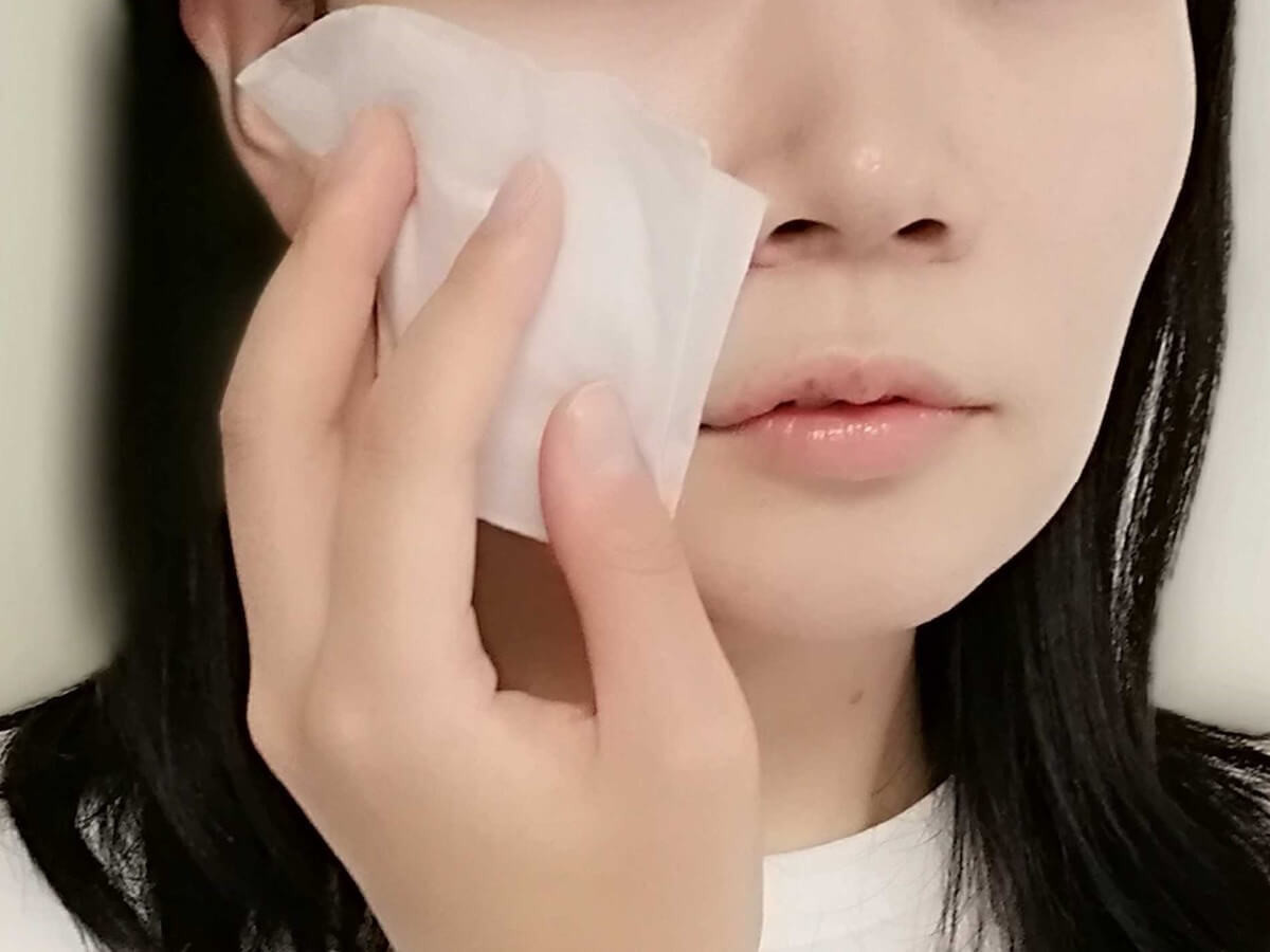 マスクで隠れている部分を拭くと、効果的です。3秒ほど頬に押し当てると、中味液がじゅわっと染み出てくるのがわかります。