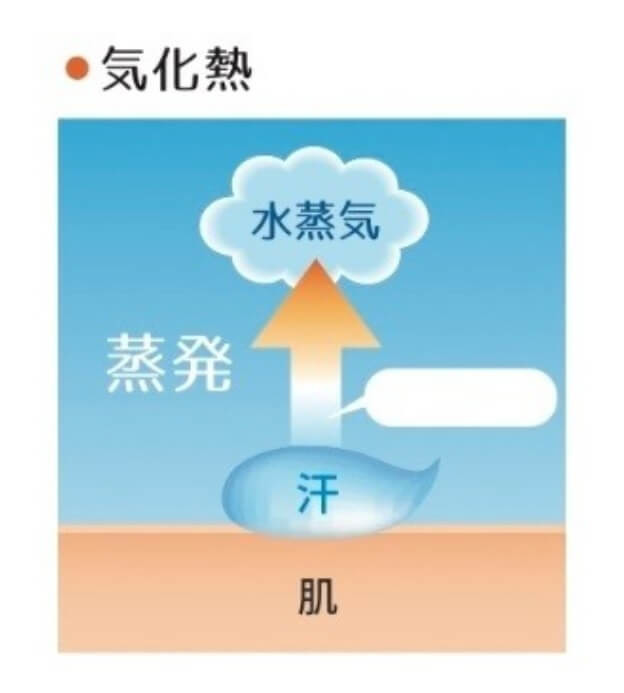 これは、暑い夏によく見かける"打ち水"と同じ現象です。熱い道路に水を撒いて、蒸発する時に道路の温度が下がるように、肌の上でも同じことが起き、肌の温度を下げてくれるのです。