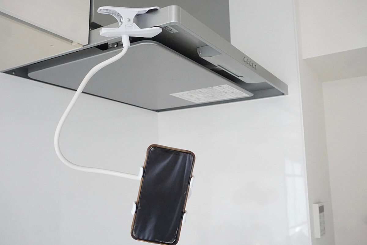 スマホクリップ式ホルダーを目線の高さに取り付ければ、見やすく汚れにくくなりますし、狭いキッチンでスペースを確保する必要もなくなります♪