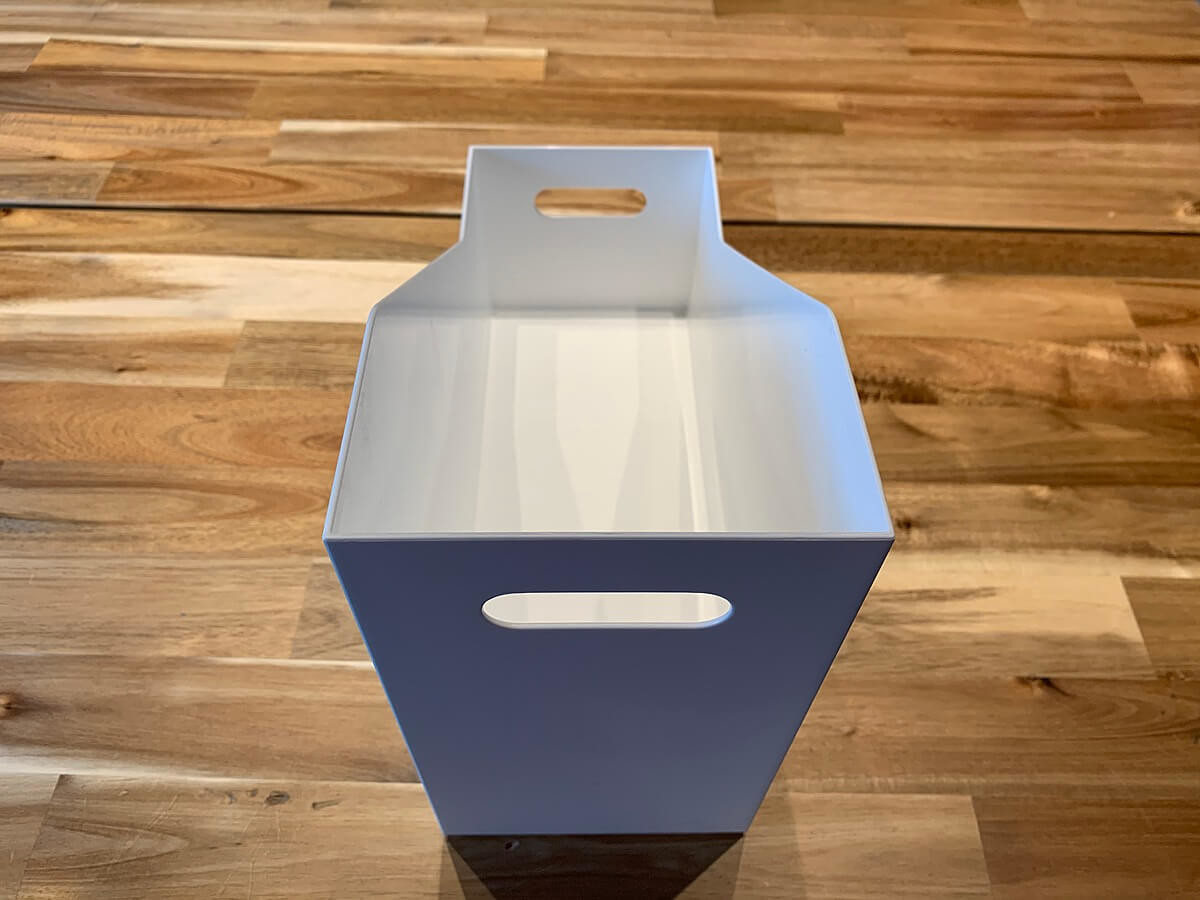 薄くて軽く持ち手がついているので、持ち運びが楽。四角いので戸棚に片づける際もおさまりがよく気に入っています。