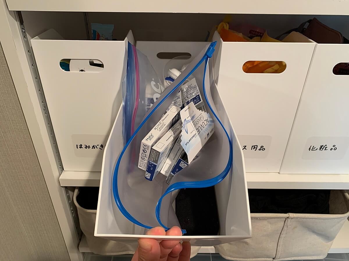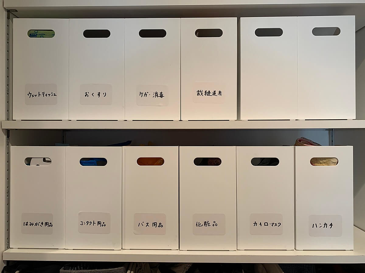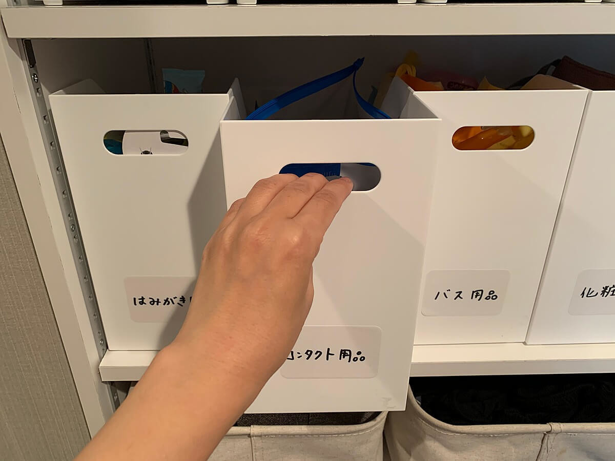 収納アイテムごとにポイポイ収納。高い方の面を外側に向ければ見た目はすっきり。