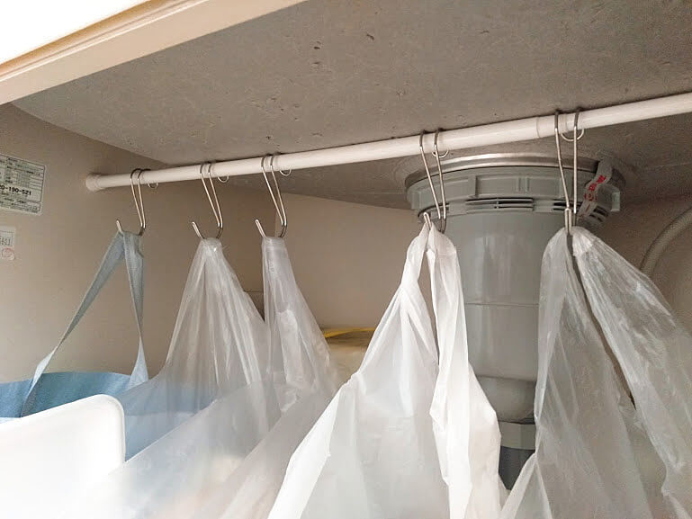 キッチンシンク下のごみ箱スペースは、「つっぱり棒×○○」で捨てるときまで快適ラクちんです!