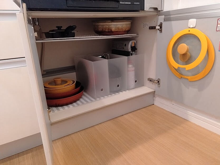 鍋やフライパン、カセットコンロやフードプロセッサーなど調理機器は全てコンロ下に収納している我が家。