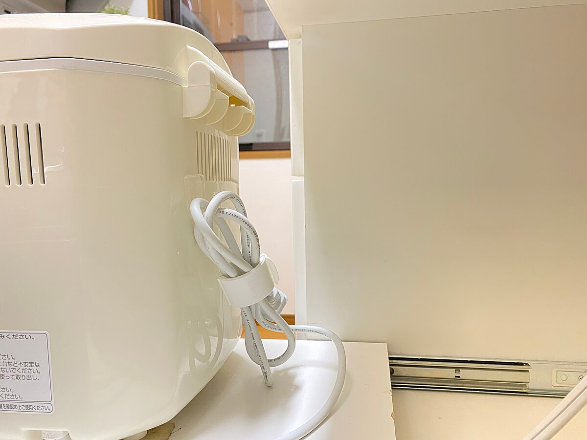 これはわが家で使っているホームベーカリー。月1の頻度でパンを作っています。使わない時はコードホルダーでまとめて、本体に付けたダイソー「クリア粘着フック」に吊るしています。