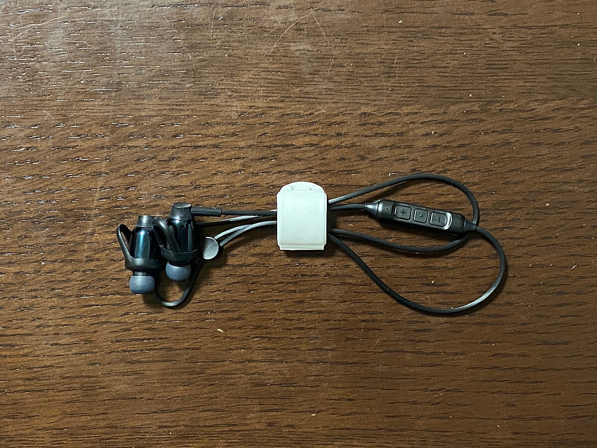 イヤフォンケーブルも、コンパクトに丸めてコードホルダーで止めています。通勤時はバッグの内ポケットが収納場所。帰宅したら、充電器のポーチにしまっています。万が一イヤフォンの充電がなくなっても、持ち運び用の充電器からもチャージできるので、とても便利です。