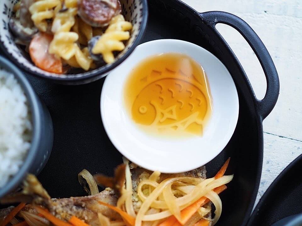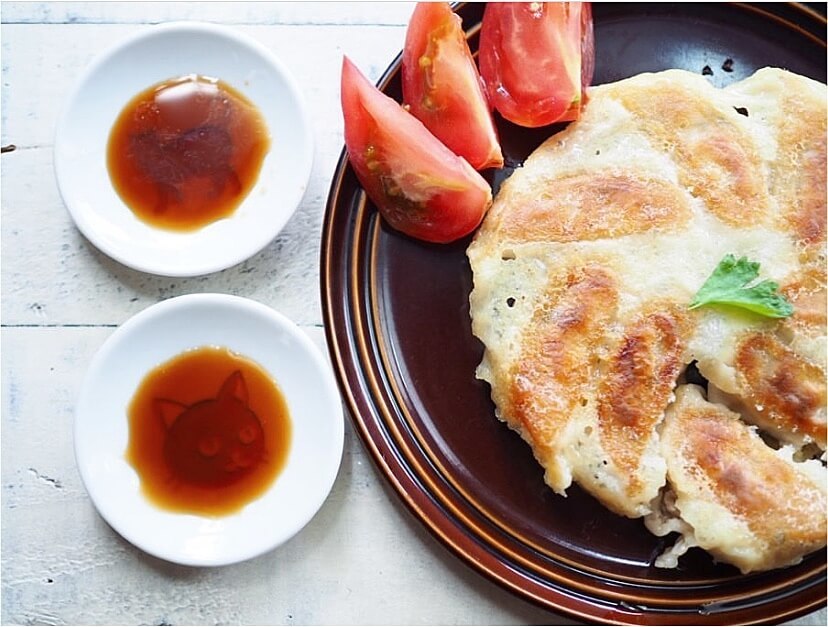 シンプルな白いお皿ですが、絵柄が型押し加工してあるので、タレを入れると……。