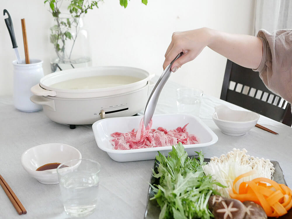 もりつけトングは衛生的にお肉を一枚ずつ綺麗にはがせるところもポイント。また、持ち手が長いので、手元が熱くならず鍋料理や揚げ物などでも活躍。