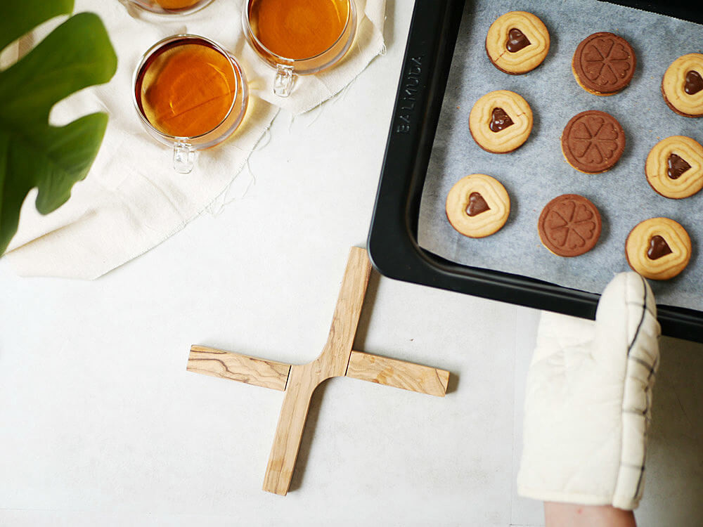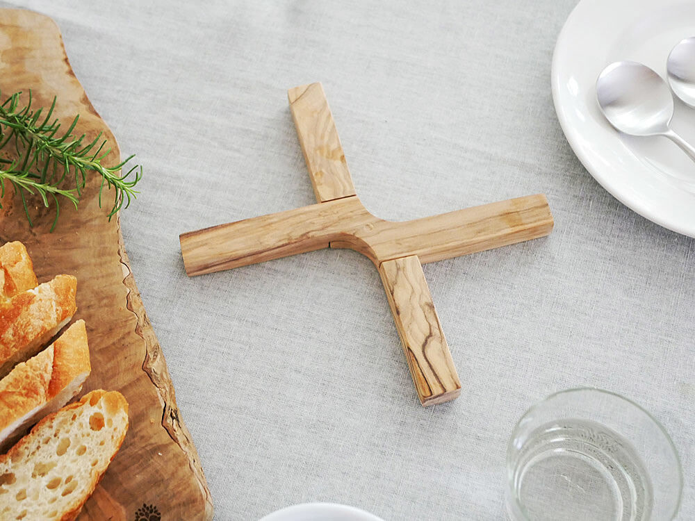 丈夫なオリーブの木で造られた「OLIVE WOOD ポットマット クロス」。天然木がおしゃれでコンパクトに収納持ち運びできる鍋敷きをご紹介します。