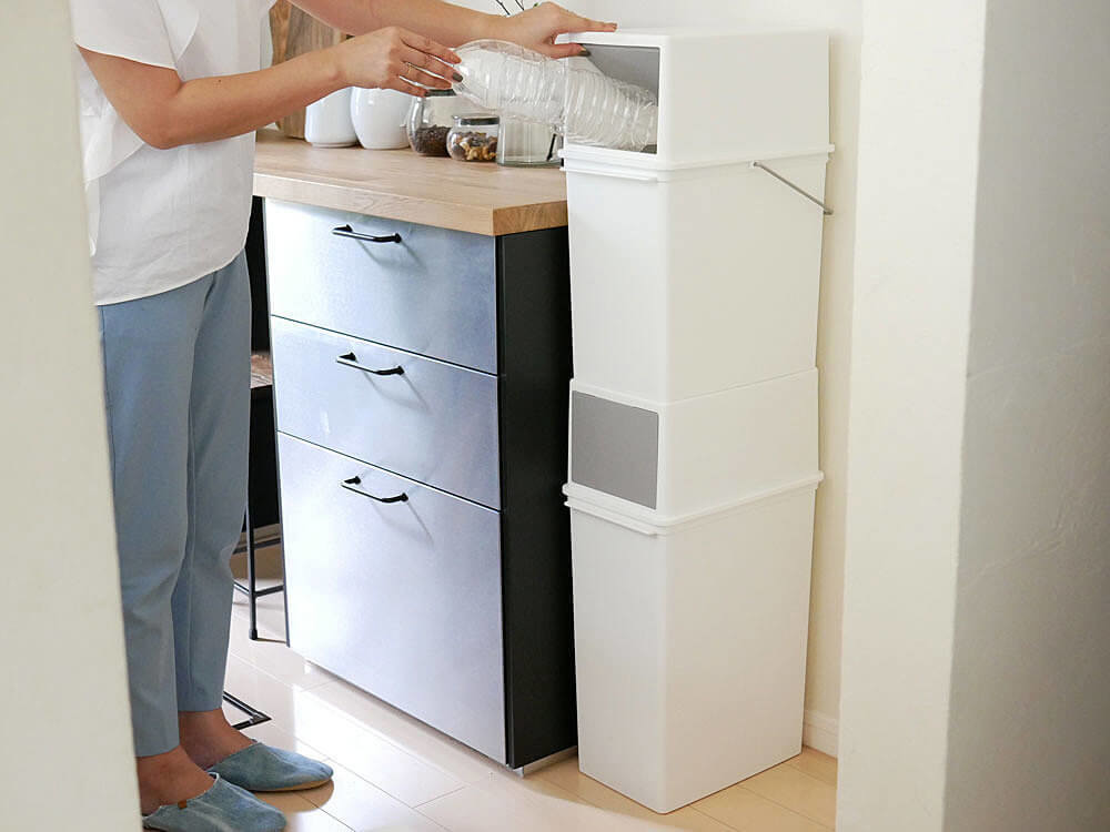 上段には頻繁に捨てるペットボトルや空き缶、下段には不燃物などライフスタイルに合わせたスタッキングが可能です。
