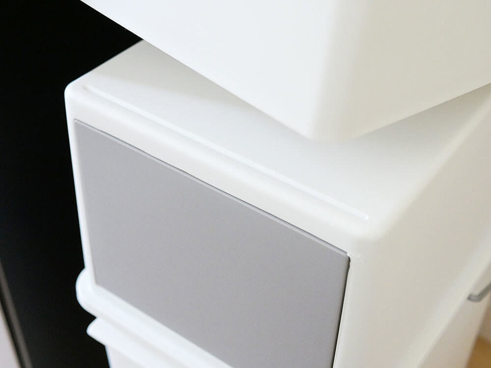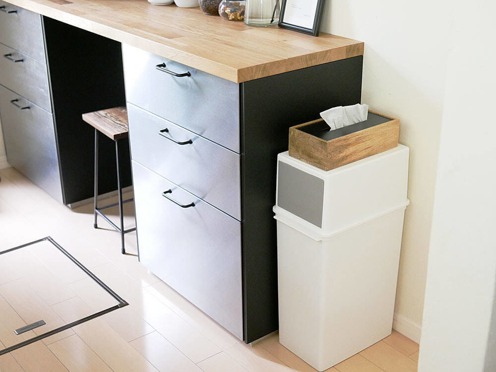 蓋が上に開くゴミ箱とは違い、フロントオープンなのでカウンターやデスクの下に置いても上部のスペースを気にせずスマートに収まります。