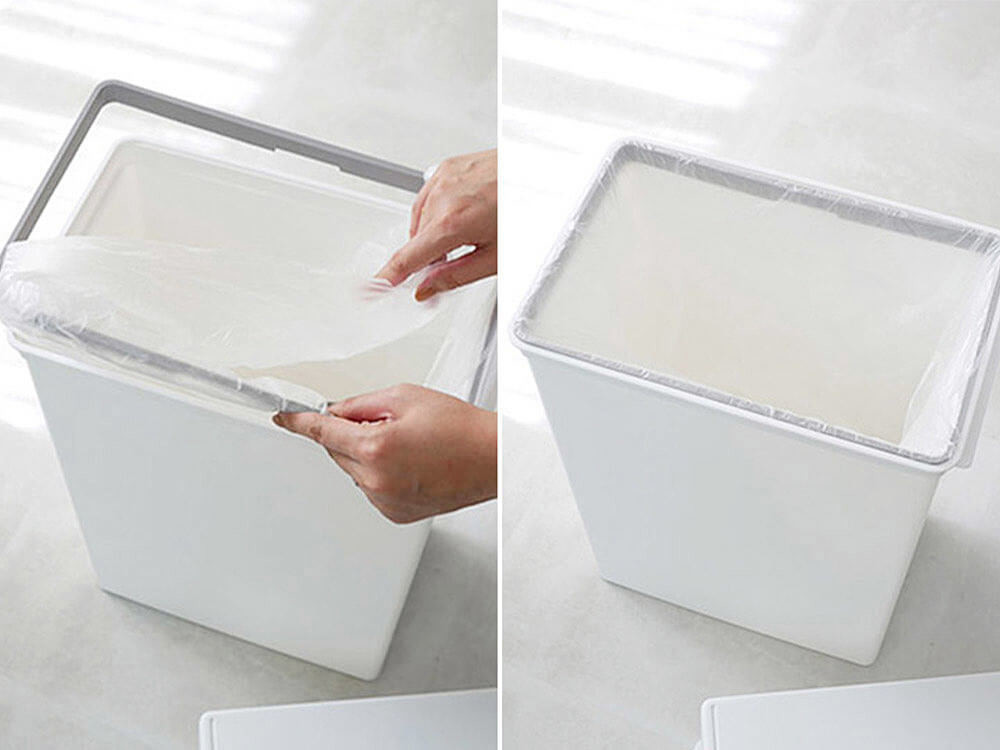 袋止めの枠を本体から外し、枠にゴミ袋を掛け本体に戻せば、簡単に固定されます。しかも外側から袋が見えずらいので、見た目もスッキリですね。