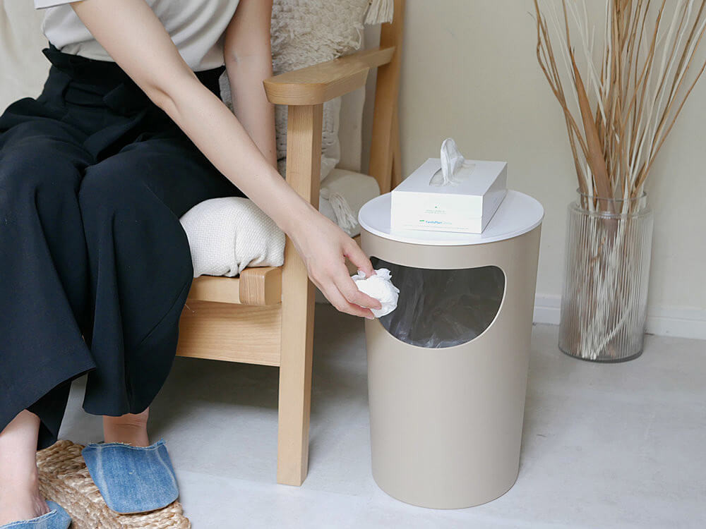 くつろぐソファやベッドサイドから手が届く位置にあれもこれもと欲張りたいのが普通の感覚。コーヒーも置けてゴミくずが捨てられて、時には新聞や雑誌も片付けられる、もはやわがままボディのゴミ箱。