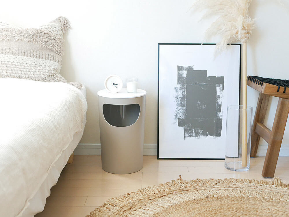 ゴミ箱とサイドテーブルが一体化しているので、ベッドサイド横に色々と並べなくてもこれ一つで省略できちゃいます。