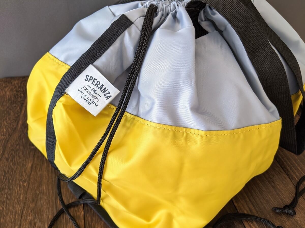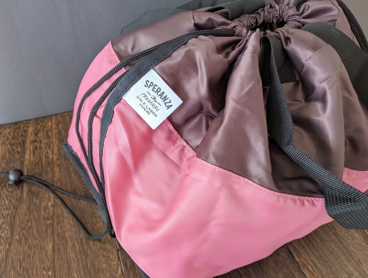 サイズは縦約31cm(持ち手含まず)、横約35cm、マチ幅約24cmです。 口は紐でキュッと縛っておけるので、荷物が飛び出す心配もありません。