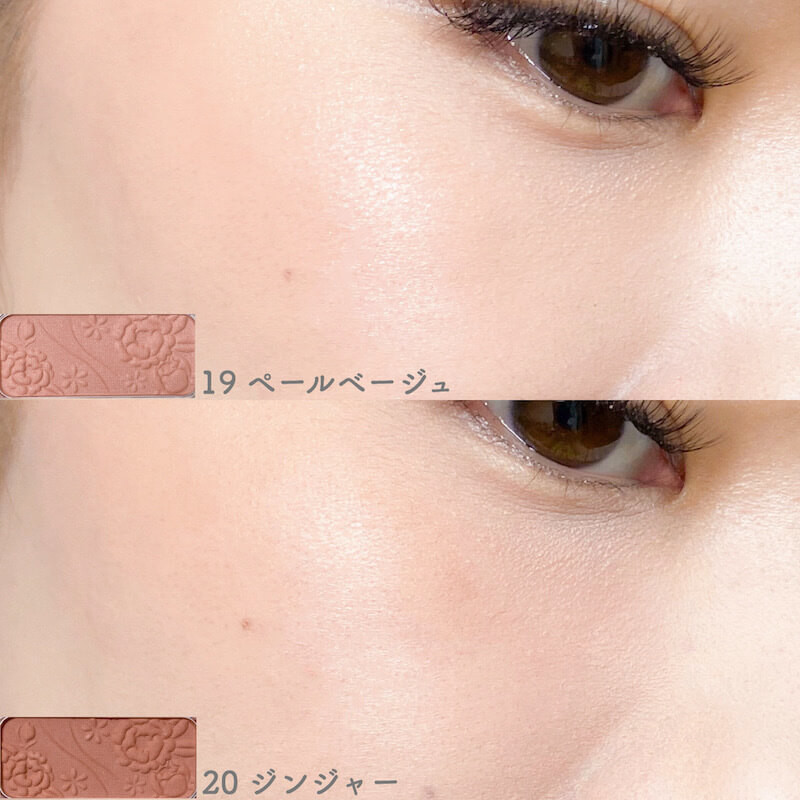 実際に頬につけてみると『19:ペールベージュ』 は、 『20:ジンジャー』 に比べてピンク寄りのカラー。 頬の高い部分にツヤ感も感じられます。