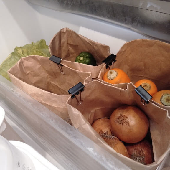 プラカゴで仕切るより掃除もラクな上、最後はごみ袋としての役割も担ってくれる「紙製水切りごみ袋」を野菜室収納にぜひ一度使ってみてください!