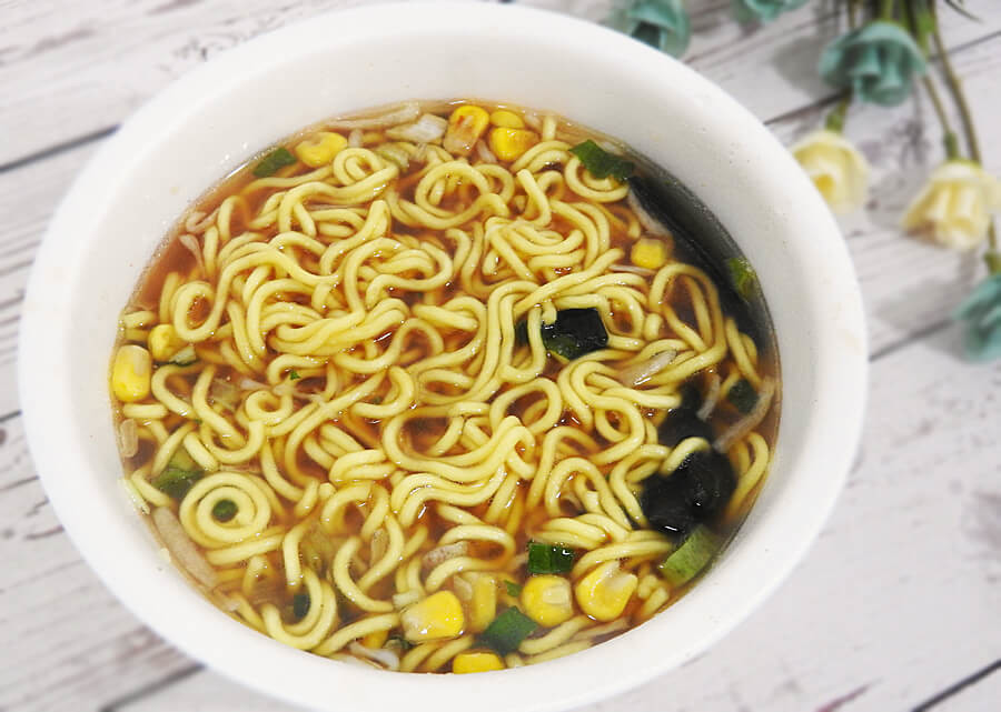 熱湯4分で完成。わりと具材は多めに入っている気がします。わかめやもやし、ねぎ、コーンが入ってますね。コーンがしなびていないのが嬉しいポイント。