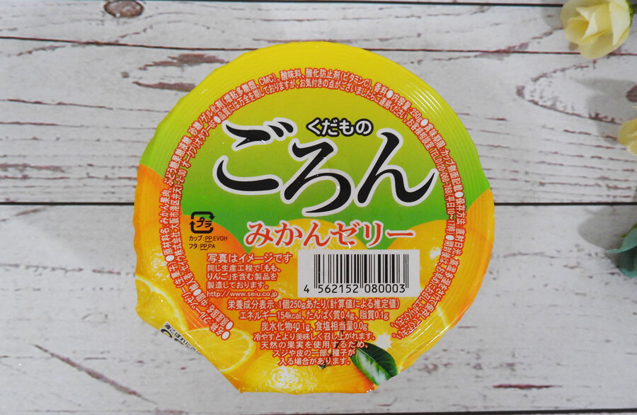 トライアルでは、フルーツゼリーも安い!今回は「くだものごろん みかんゼリー」69円(税込)を買いましたが、同価格でももやマンゴーが入っているゼリーもありましたよ。